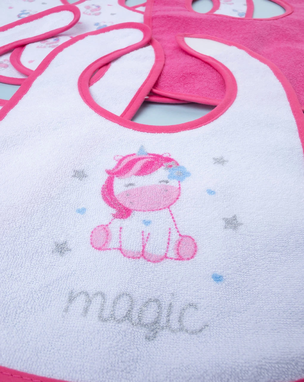 Tenero pack 5 bavaglini piccoli in spugna da bambina 100% cotone. I capi si sviluppano in varie tonalitĂ di rosa e presentano differenti stampe âUnicorniâ. Lâallacciatura è pratica è sicura grazie a bottone automatico sul girocollo. Accessori non in vendita. La confezione contiene solo il capo dâabbigliamento