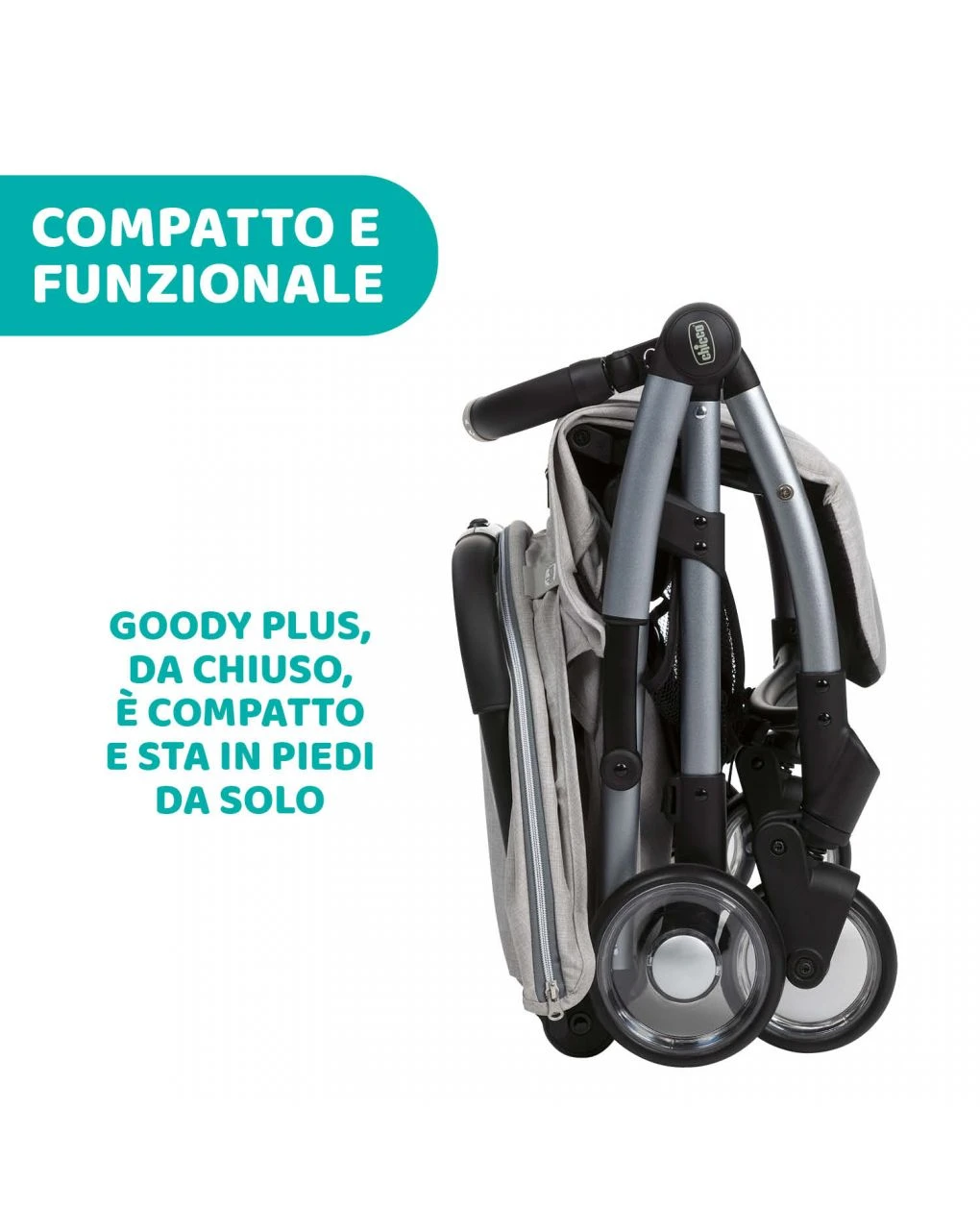 Il passeggino Goody Plus è stato ideato da Chicco per essere straordinariamente pratico e maneggevole. Basta premere il pulsante presente nel maniglione e il passeggino si chiude da solo, risultando incredibilmente compatto. Goody Plus accompagnerà il tuo bambino dalla nascita sino ai 4 anni di età . Infatti la seduta ampia e lo schienale regolabile in 3 diverse posizioni e il poggiagambe, garantisce sempre il massimo del comfort e del relax, mentre la barra di protezione frontale e il paracolpi assicurano protezione al piccolo. E con la cappottina con inserto estraibile e trattamento waterproof e UV+50, il tuo bimbo sarà sempre protetto. Grazie ai dettagli in prezioso materiale rivestito e alle cuciture in contrasto, i tubi anodizzati e le ruote trasparenti in policarbonato il passeggino Goody Plus rappresenta un mix perfetto di comodità , tecnologia e design di qualità , un sistema modulare completo che si combina alla perfezione con la navicella morbida e seggioloni auto Kiros e Kaily della linea Chicco.