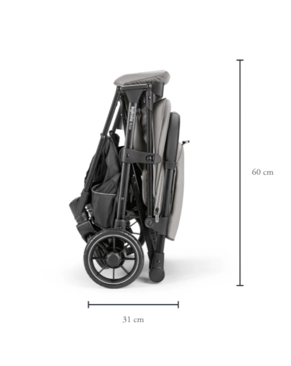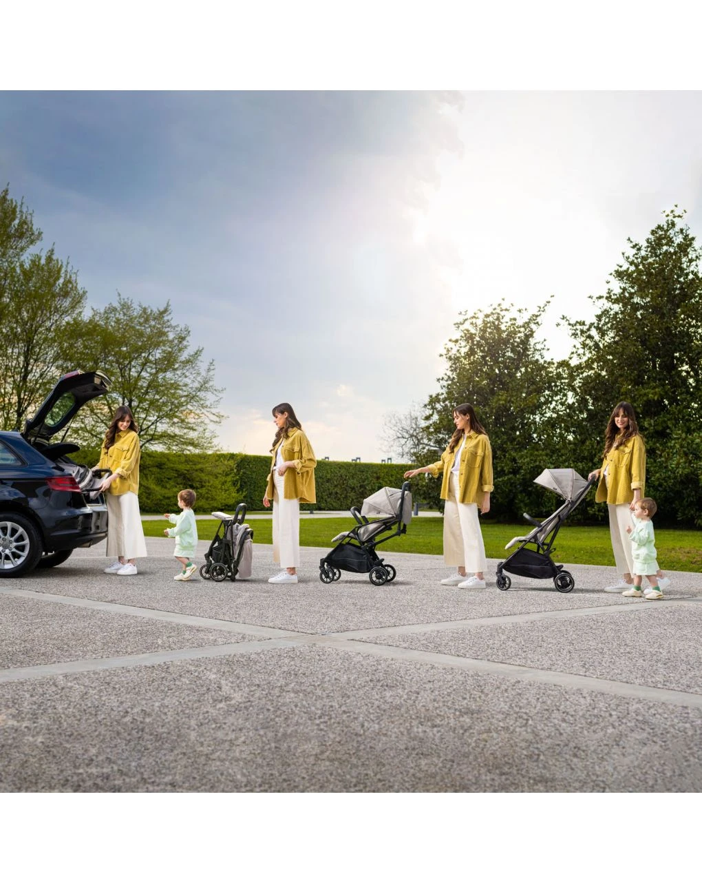 La chiusura viene azionata con un semplice tocco e il passeggino si chiude da solo e rimane sempre in piedi, in qualsiasi condizione (con schienale reclinato, con capotta completamente aperta, con ruote non allineate). Si porta ovunque grazie alla sua leggerezza (solo 7,2 kg) e alla compattezza da chiuso.