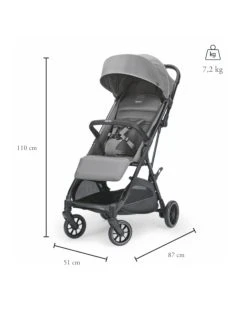 La chiusura viene azionata con un semplice tocco e il passeggino si chiude da solo e rimane sempre in piedi, in qualsiasi condizione (con schienale reclinato, con capotta completamente aperta, con ruote non allineate). Si porta ovunque grazie alla sua leggerezza (solo 7,2 kg) e alla compattezza da chiuso.