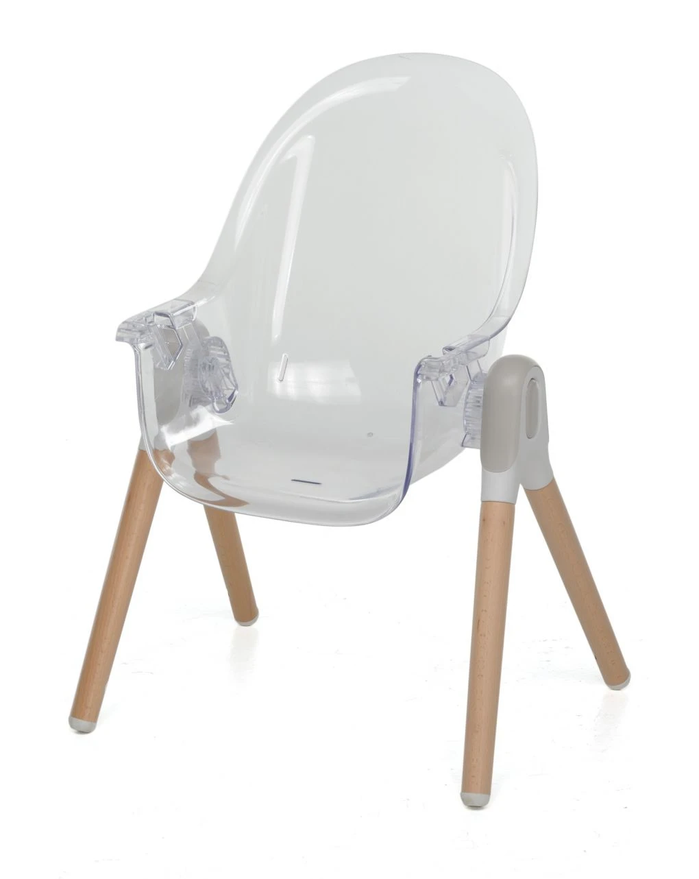Seggiolone baby sedia 2 in 1. Utilizzabile come seggiolone da 6m a 15kg e come baby sedia da 3 anni a 25kg. Facilmente trasformabile. Gambe modulabili in legno massiccio di faggio, seduta reclinabile in metacrilato trasparente. Imbottitura ergonomica in tessuto effetto pelle.