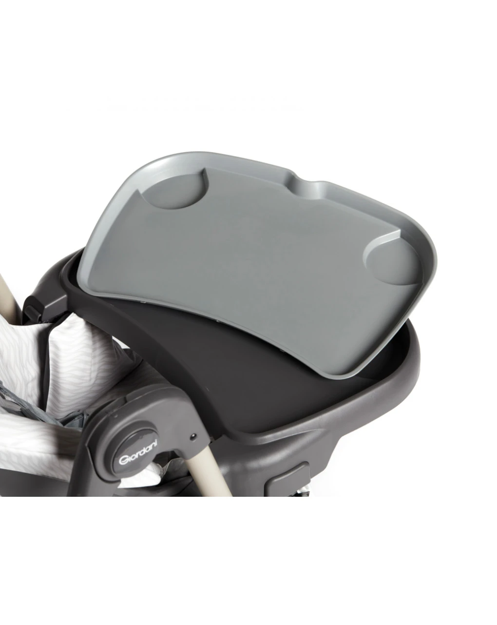 Il vassoio regolabile e removibile ha 2 tavolette, quella superiore è coordinata con il colore dell’imbottitura.