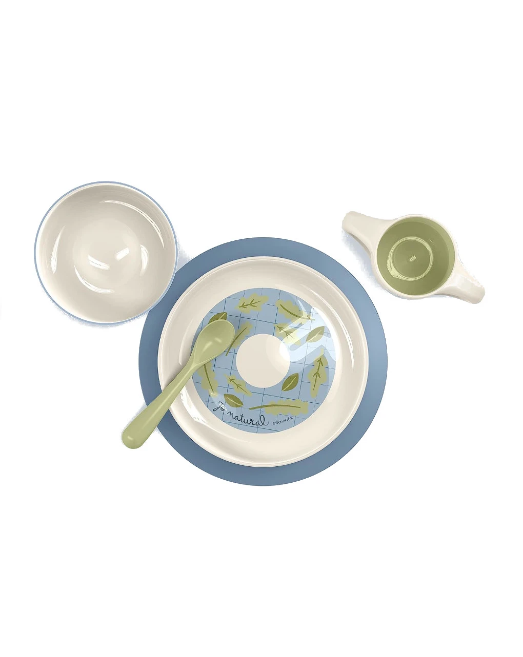 Set di accessori per imparare a mangiar da soli. Il set include un piatto piano, una scodella, un cucchiaio, una tazza con manici e una pratica tovaglietta antiscivolo